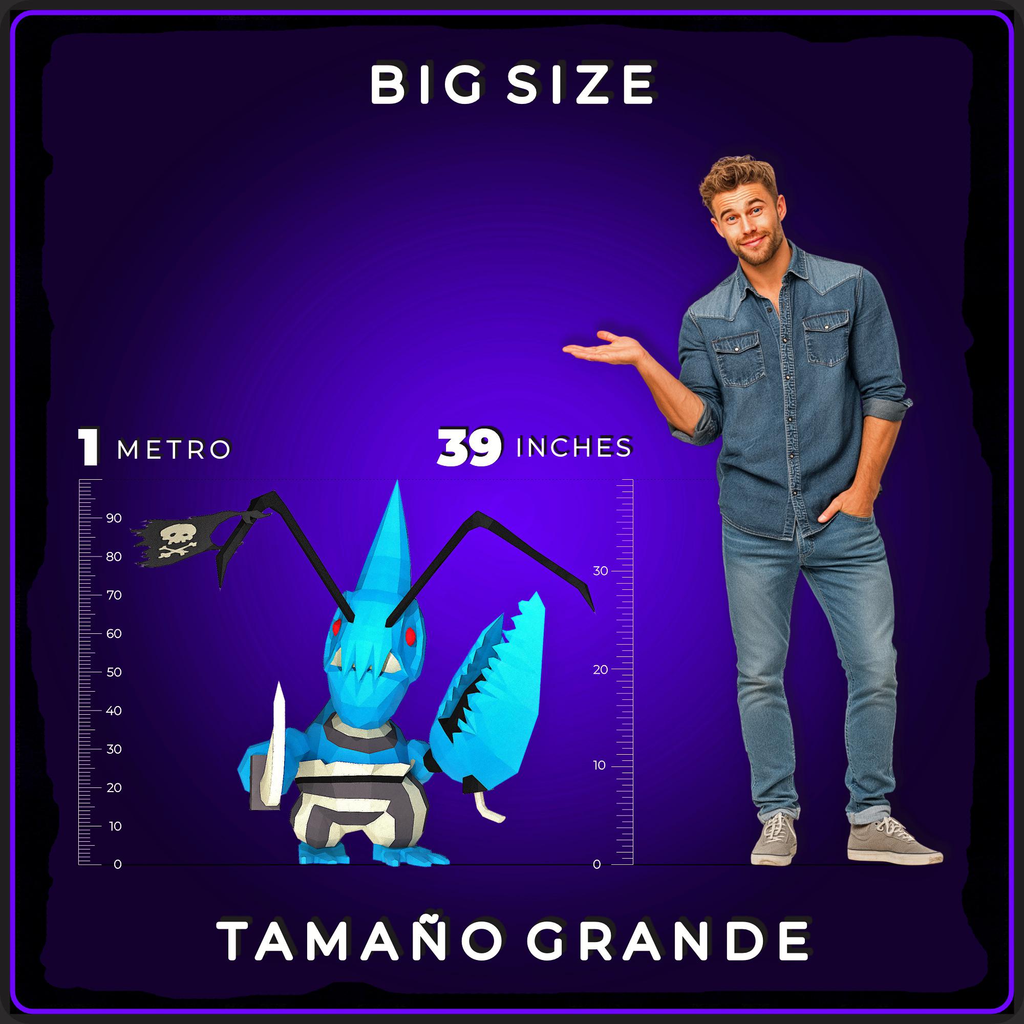39 inches tall. Weathered blue shell marked by salt and time. One burning red eye. A curved sword in his right claw — recovered from an unnamed shipwreck. A cannon in his left, fuse intact, load status unconfirmed. A black skull flag tied to his antenna. Not as decoration. As a warning.