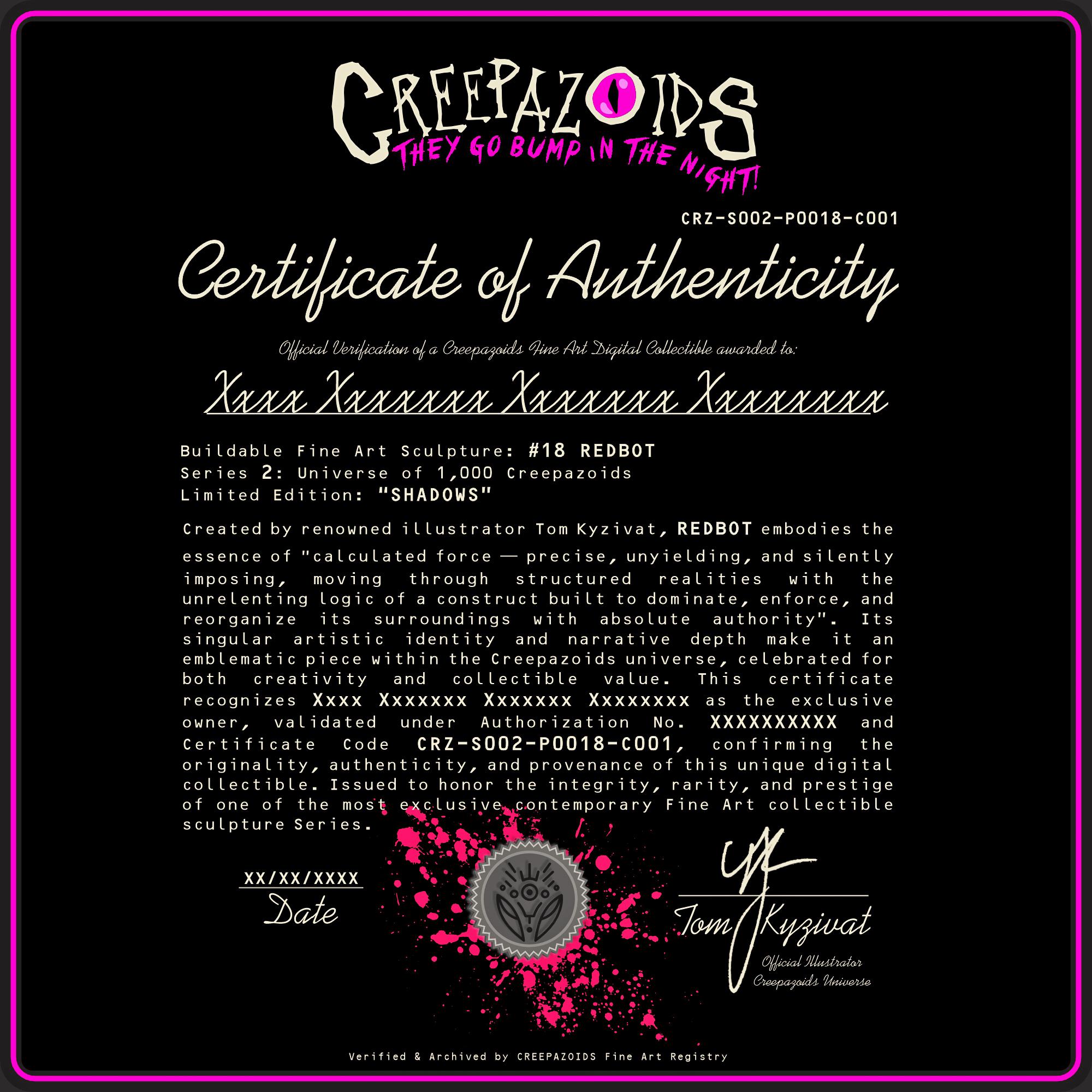 REDBOT is Entity N.º 018 in an expanding system. One edition is already permanently closed. Creepazoid N.º 1000 is still unrevealed.
