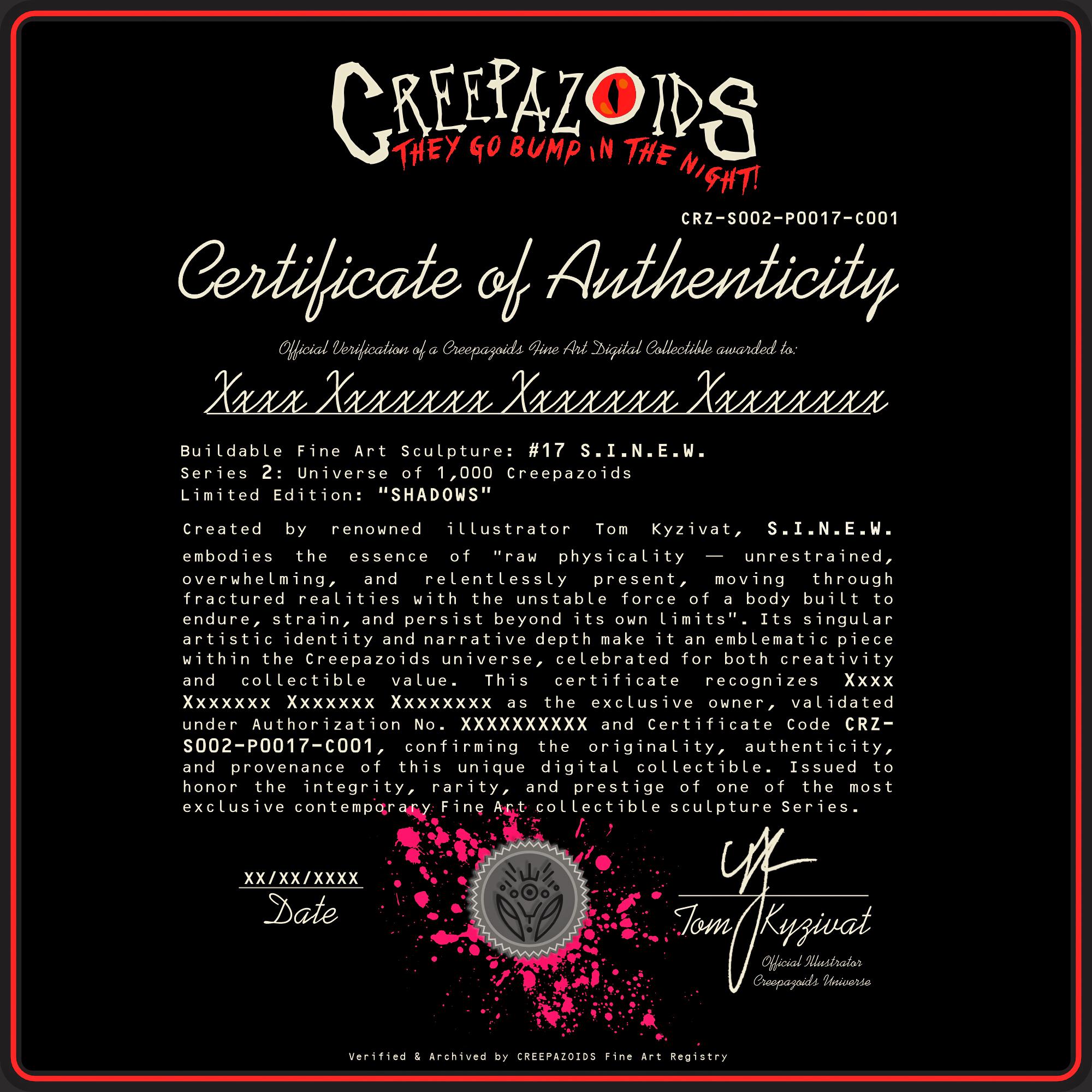 S.I.N.E.W. is Entity N.º 017 in an expanding system. One edition is already permanently closed. Creepazoid N.º 1000 is still unrevealed.